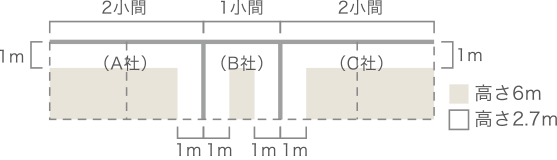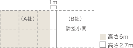 隣接小間との境界線より1m以内は高さ2.7mまで。それ以外は高さ6mまで。