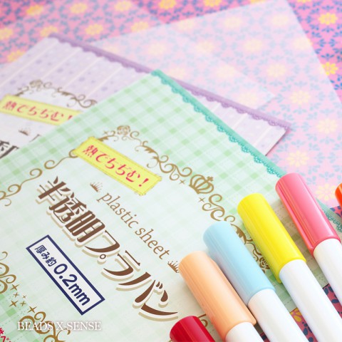 写真の作品は、実はすべて同じ形。カット済みのプラバンにお好きな色を塗って作るので、色や模様の違いで、あなただけのオリジナル作品に仕上がっちゃいます。