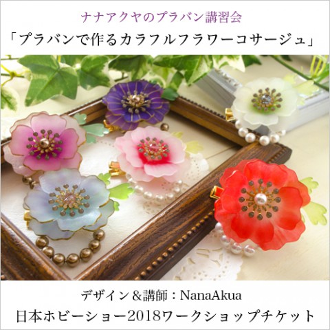 立体プラバンの第一人者ナナアクヤさんデザイン&講師によるフラワーコサージュのワークショップが今年もホビーショーでも開催決定!お席を確約する予約チケットはホームページで4/18まで販売です。