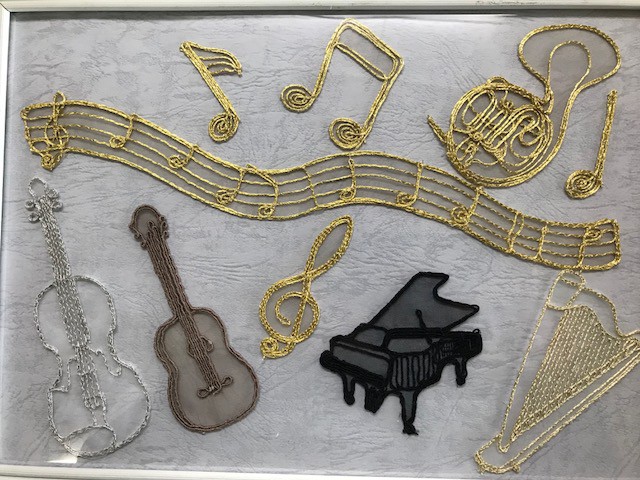 巻きバラの連続のブレード調@540.これに葉っぱの連続を組合せたもの@760.楽器シリーズ(ハープ@220~.ギター@280~.ウクレレ@140~.五線譜@200~.フレンチホルン@310~.)アニマルシリーズ(猫ちゃん@390.ウサギ@400.イヌ@200.)マリンシリーズ(ヨット@100~.ヤシのある島@200~.ホヌ@200~.)天使の羽155~.天使200~.蝶.ツリー.葉.根っこ.モンステラ.等々楽しい.可愛いモチーフいっぱいです。球系の組み立てモチーフ@520~.は形を作った後、布用硬化剤で任意の硬さに出来たり、楽しい物作りが始まります。
