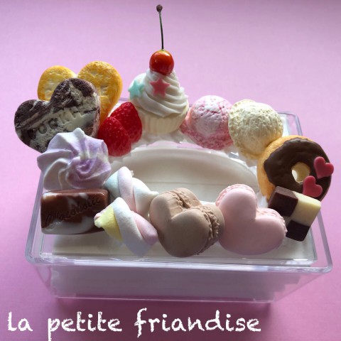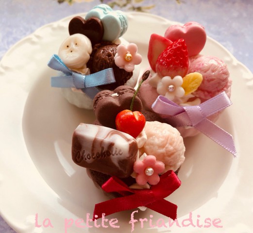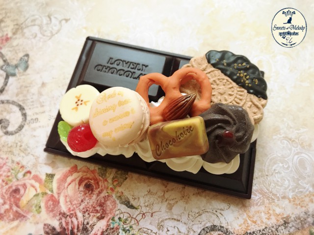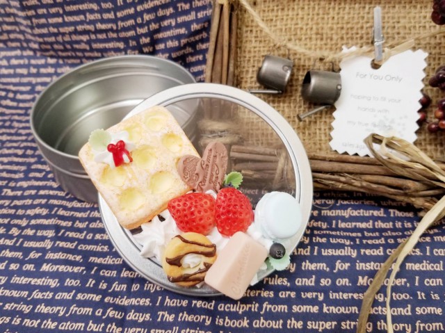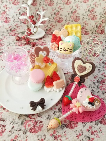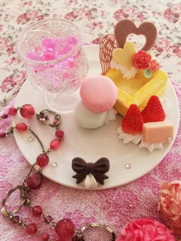 キューブ型のケーキを作り、ハートチョコにキラキラパウダーをつけておしゃれに!イチゴやマカロンをデコレーションし完成!消臭ビーズの入ったグラスを乗せて癒し効果をプラス。キューブケーキにはピアスや指輪等お気に入りの小物を入れることができます!