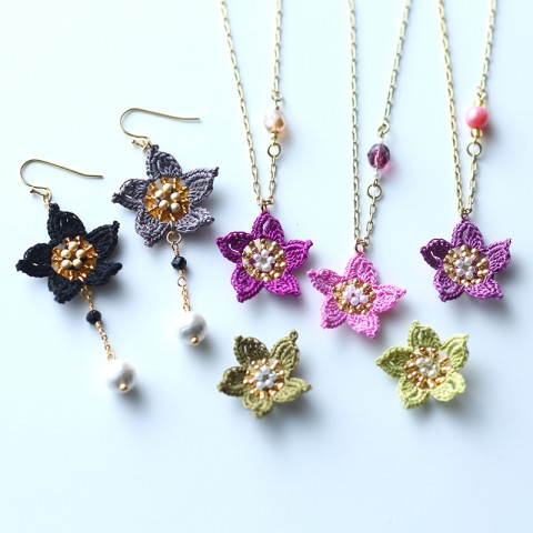 テナライの『トルコの伝統手芸 オヤのレッスン』の監修・デザインの「ビーズの縁飾り研究会」がビーズを編み込むレース編みで花モチーフのアクセサリーを作ります。花モチーフ2つ分の材料つき、ネックレスかピアスが選べます。作るのは花モチーフのみ、ネックレスとピアスはパーツつきのものを仕立ててあるので、丸カンでつけるだけ。出来上がったらその場でつけられます。花モチーフの糸は、お好きな色をお選びいただけます。
