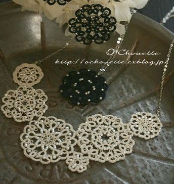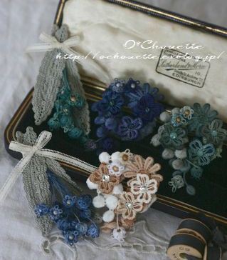 タティングレースのモチーフを使って、普段使いの出来るアクセサリーや小物に仕立てています。