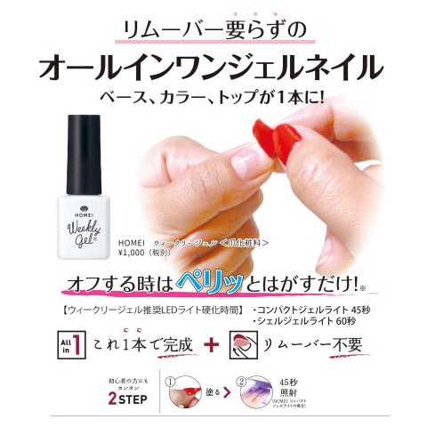 ベース+カラー+トップが1本になったHOMEIウィークリージェルネイルのご紹介しています!ぺりっとオフするだけでリームバーいらずのジェルネイルです。実際にお試しいただける他、アレンジのご紹介もしておりますのでぜひこの機会にお立ちより下さい。皆様のご来店をお待ち致しております。