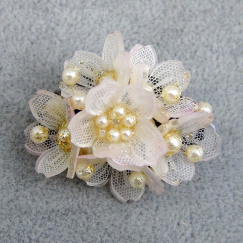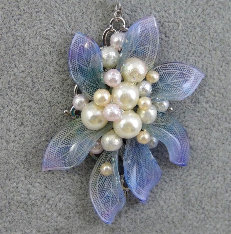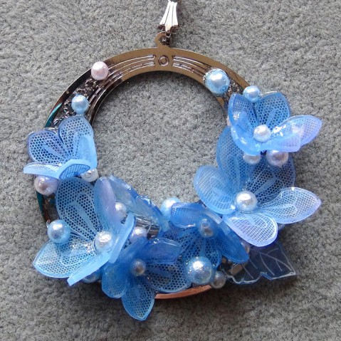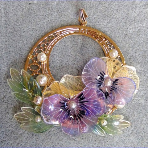 前もってスタンプで図案を写してあるプラ板から花や葉のパーツを作り、アクセサリーに仕立てます。