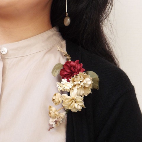 ブドウの房をモチーフにした愛らしいコサージュ『レザン』は、日々の暮らしをささやかに彩るアイテムとして通年でご使用頂けるよう意識してデザインさせて頂きました。
