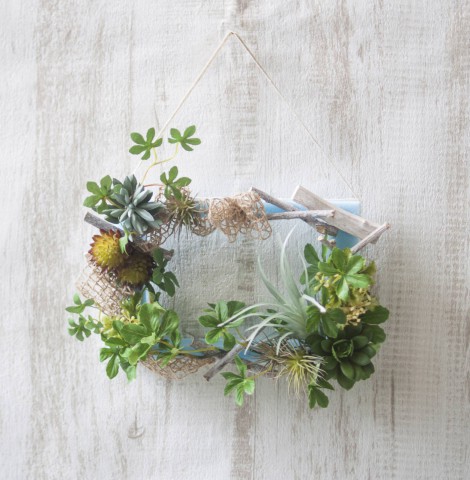 人気の多肉植物をフレームに配置したナチュラルな壁掛けを作ります。